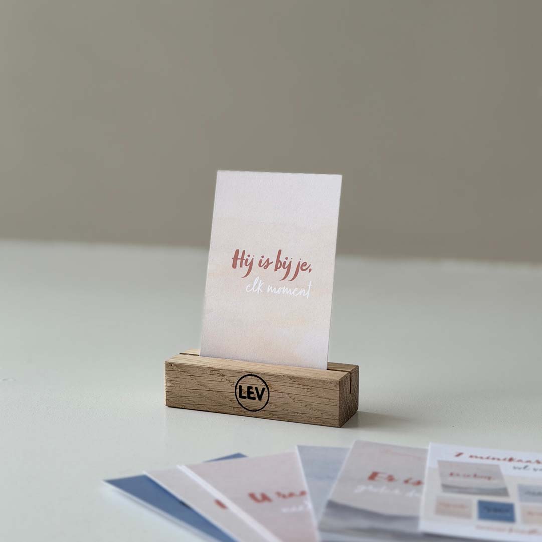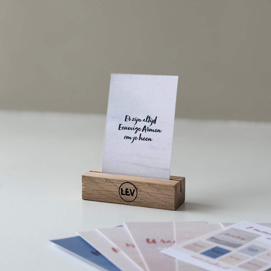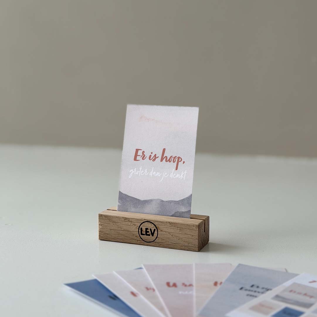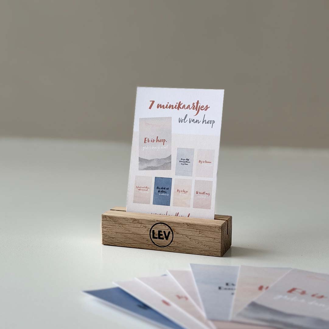 Speciaal bij het nieuwe album ‘Kleine Sprankjes Hoop’. Het zijn 7 kaartjes met woorden uit een aantal liedjes van het nieuwe album. Inclusief mini standaard (speciaal gemaakt door Bron van Hout) van eikenhout met logo.