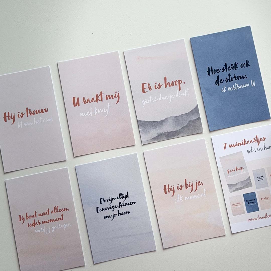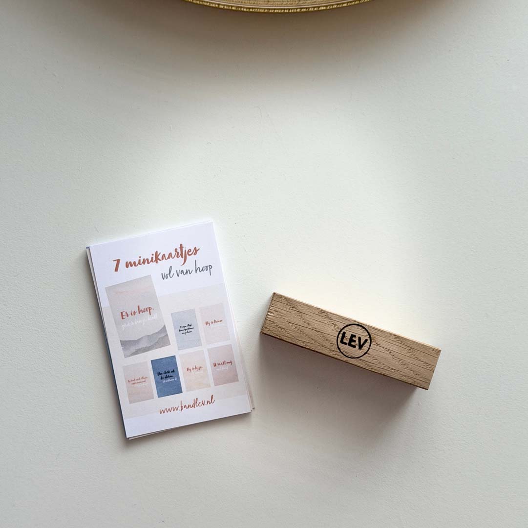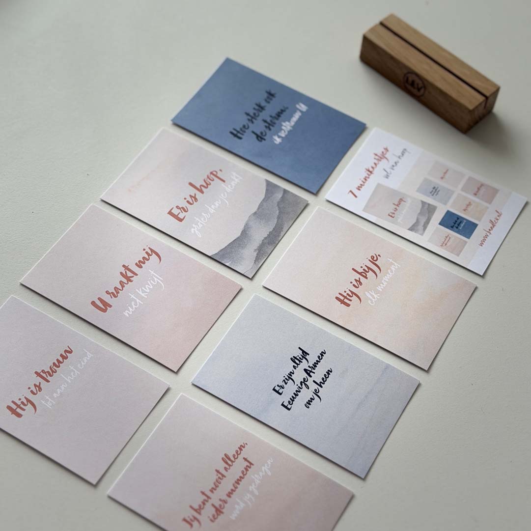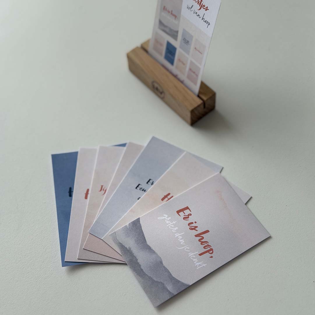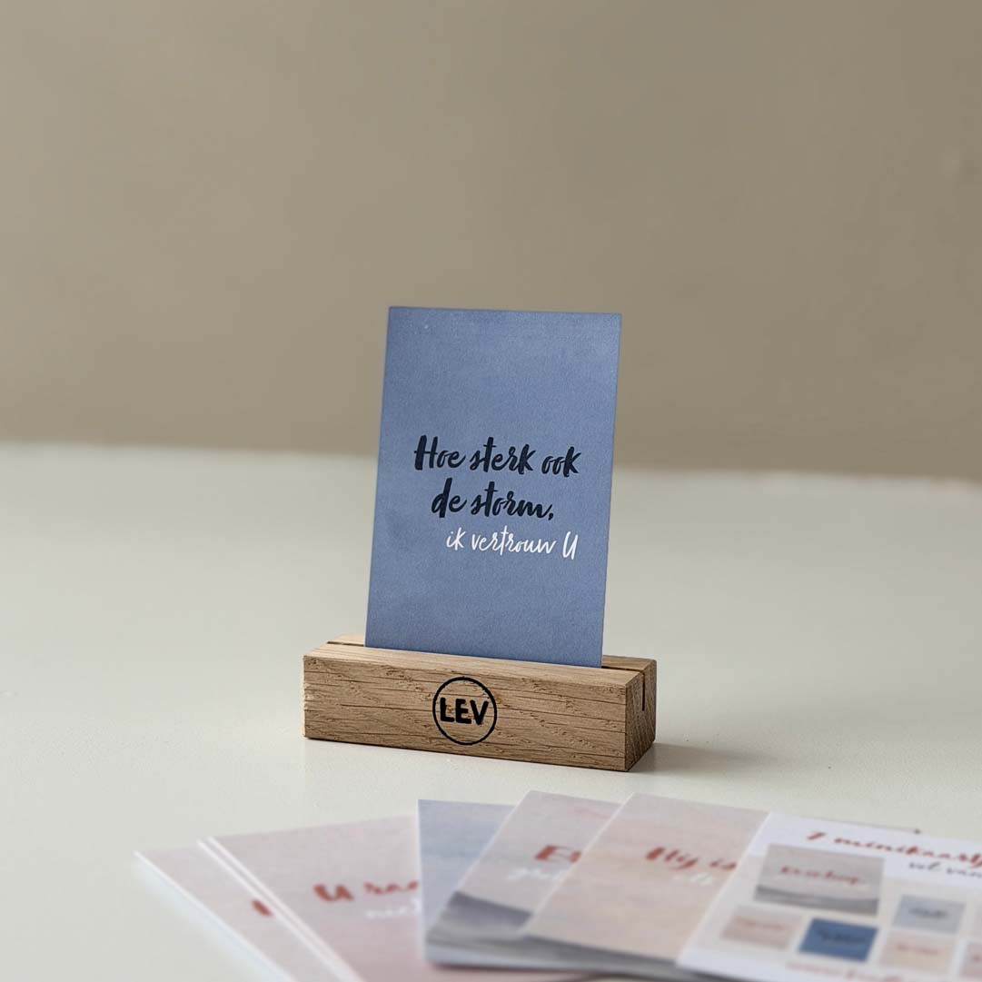 Speciaal bij het nieuwe album ‘Kleine Sprankjes Hoop’. Het zijn 7 kaartjes met woorden uit een aantal liedjes van het nieuwe album. Inclusief mini standaard (speciaal gemaakt door Bron van Hout) van eikenhout met logo.